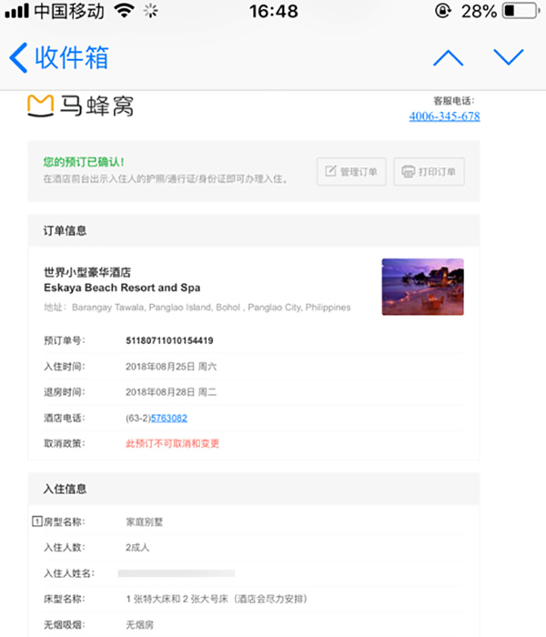 李女士告诉记者,她于2018年7月11日在马蜂窝网站上预定了位于菲律宾薄荷岛的世界小型豪华酒店,入住时间2018年8月25日-28日,共计三晚,房型为两卧室的家庭别墅,总金额人民币19796.18元。她还向记者出示了预定当天收到马蜂窝的确认酒店预订成功的电子邮件。“因为两家人带着三个小朋友,所以海岛游我们准备的就是‘泡酒店’,之前千挑万选订的这家酒店,也是希望各种设施能满足我的要求。”李女士向记者讲述,“2018年8月25日下午两点半左右,我们到达酒店办理入住,却被告知并没有我们的订单,我立刻和马蜂窝客服联系,得到的答复是马蜂窝承认确实没有帮我们预订到酒店,并且酒店当天和未来三天都全部满房,在这家酒店我们是无房可住的。”