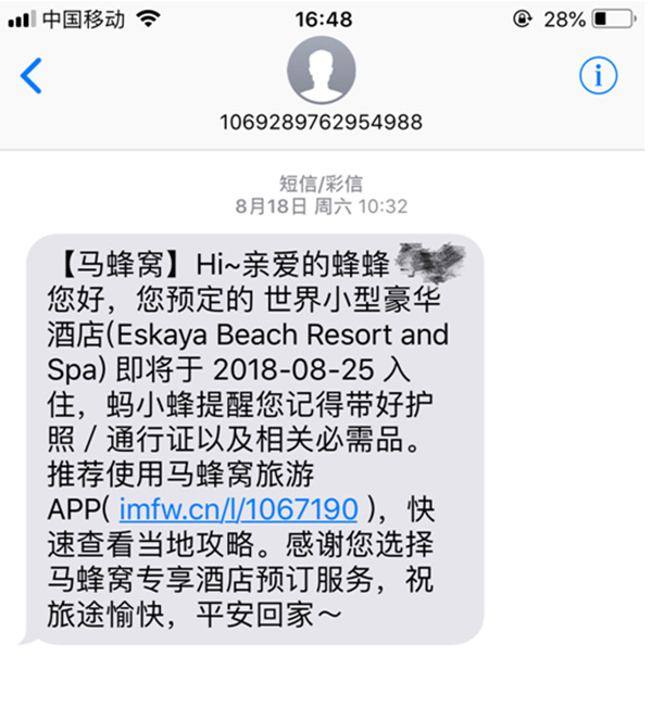 “一开始马蜂窝客服辩解说,这个订单没有定成功后尝试联系我无果,但是我从未接到过任何电话。”李女士告诉记者,预定房间后会有一个确认期,而最终她收到了预定成功的确认短信。之前她曾尝试用马蜂窝订另一家酒店,但是立即接到电话说无房,那个订单自然也没有生效。“所以联系不上我这种说辞不存在,之后马蜂窝客服一再给我电话,让我提供我之后自行订的酒店入住证明和支付金额,说要用来跟代理商谈论赔偿问题。”