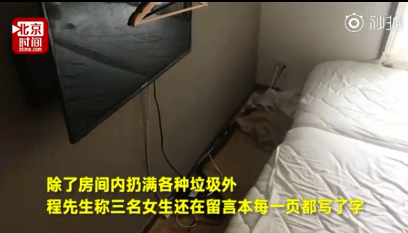 十一点半左右,程先生去房间时发现,到处是客人使用过的卫生纸、卫生巾和喝过的饮料罐,“整个房间乌烟瘴气,散发着恶心的味道。”退房后,房东发现遍地是垃圾。