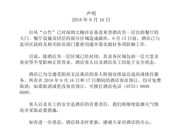 酒店已为交通受阻而无法离店的客人特别安排延迟退房或续住服务。所有在2018年9月16日和17日期间的酒店客房预订,均可免费取消;如需取消或更改客房预订,可拨打酒店电话(0755)8888 6688。