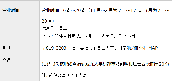 这里不仅有竹荚鱼、鲈鱼、比目鱼、鮶鱼等丰富的鱼种,还有等待一年中的不同鱼种上钩的栈桥。栈桥深入到博多湾海中386米的地方,为钓鱼爱好者们打造了一个完美的垂钓地点。客人即使空手来也没关系,园内有小卖店、租钓竿和卖鱼饵的地方,还有免费借救生外套(中学以下的孩子必须穿着)的店铺,以及耐心指导初学者的工作人员,可以说是应有尽有。从管理楼3层的展望室可以将博多湾的美景一览无余。海钓公园旁边的绿地上还可以烧烤(需要提前预约)。从初学者到有经验的钓者都可以在这里放心地体验海钓的乐趣。
