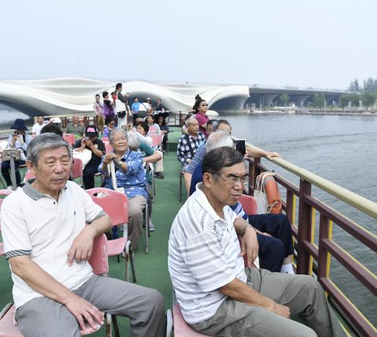 (图为社区居民在专业讲解员的带领下乘船游览大运河)