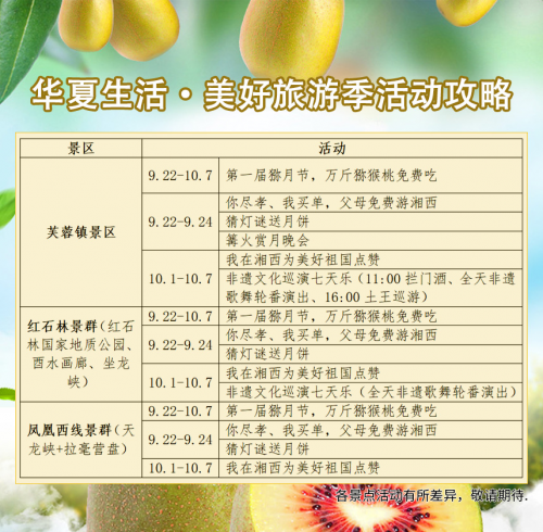 2018年9月22日至10月7日,与猕猴桃巨型堆头合影并发送至朋友圈,即可免费领取2颗猕猴桃。还有猕猴桃周边特产集市等你来逛!