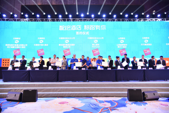 会议现场,碧桂园凤凰酒店国际管理公司、锦江国际WeHotel、昆明花之城豪生国际大酒店、香格里拉悦榕仁安旅游度假村有限责任公司、天津狗不理大酒店、山西省晋城市海天大酒店、凌源市女神宫汤泉度假城、铭家精品酒店、南阳市方圆商务酒店集团、广西永恒投资有限公司、浙江辉驿网络科技有限公司等24家企业与中国移动签订了合作协议。