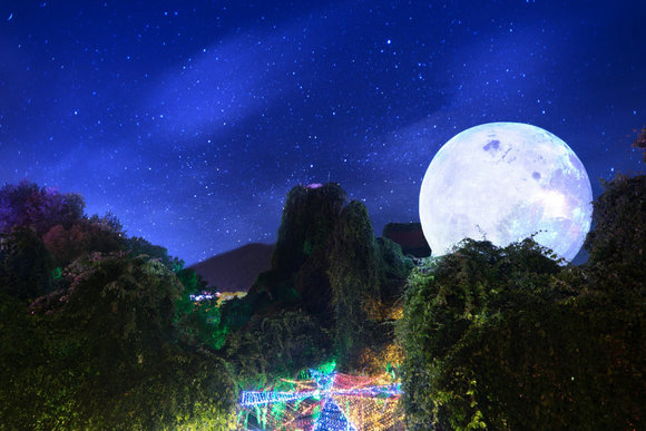 月亮造出来了,“待”哪儿好呢?超级月亮的“安身之处”,设置在了梦幻谷太古行山榕树林附近。据景区相关负责人介绍,这是为了增加月亮的真实性和梦幻感,也可以供游人从各角度花式赏月拍照。然而,这也增加了搭建的难度,原本在平地搭建只需半天,而立于假山之上,则要考虑承重点、安全性等各方面因素,因此花了整整4天。景区还用3000根藤蔓在月亮底部进行“装扮”,使其与背景融为一体,看着更加和谐。