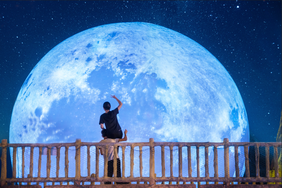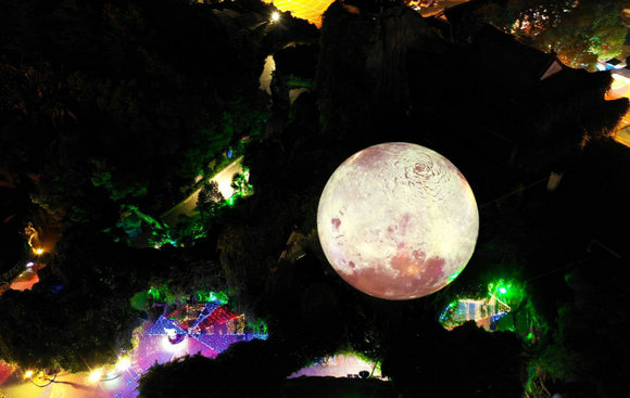 为了保证月亮“圆圆的身材”,前期通过4个鼓风机经过一周测算,找到了最适合的饱和度。内部则设置4个光源,根据夜空和景区的实际亮度,调整“月色”。因为月亮搭建在假山上,四面八方都没有挡风的地方,在最初搭建时突遇大风,生生“夭折”了一个。为了更好地“守护”好月亮,抵抗大风下雨等恶劣天气,目前的月亮至少被打了24个固定点。