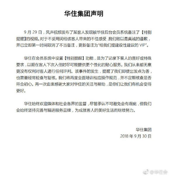 30日上午,华住集团发表声明称“对于不妥用词给客人带来的不佳感受,我们致以最真诚的道歉,并已立即第一时间取消了不当备注,更新备注为‘给我们提建设性建议的VIP’”。