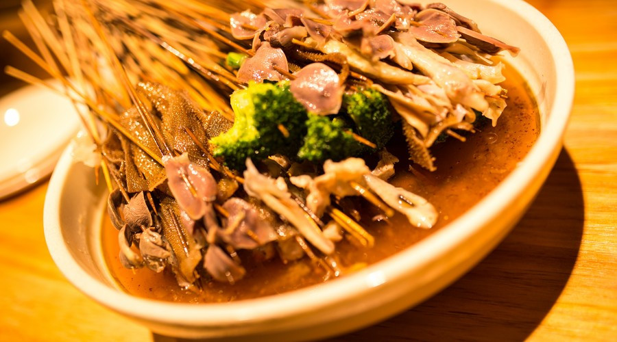 海鲜、牛肉、鸡翅、毛肚、香肠、鱿鱼、火腿、藕片、豆皮、土豆、蔬菜......几百种食材用竹签子串起来,放在热气腾腾的砂锅中快速汆熟,食材的营养和口感被瞬间封存。