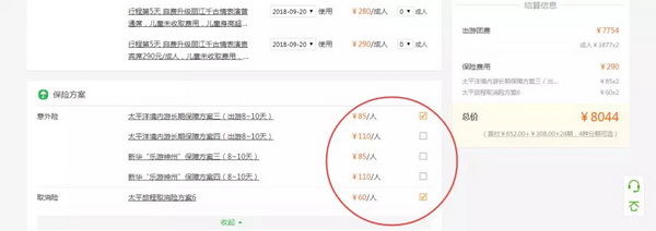 记者核对信息后发现,原本3535元/人的套餐,在结算时却多出了290元的保险费用。经仔细查看,记者发现这两款保险分别为85元/人的“太平洋境内游长期保障方案三(出游8-10天)”和60元/人的“太平旅程取消险方案6”。这两款保险分别是意外险和取消险,均为系统自动默认勾选的额外收费服务,而这多出来的费用在先前的购买页面中并没有明示,并且在结算信息页面上并没有可供反向勾选的选项。