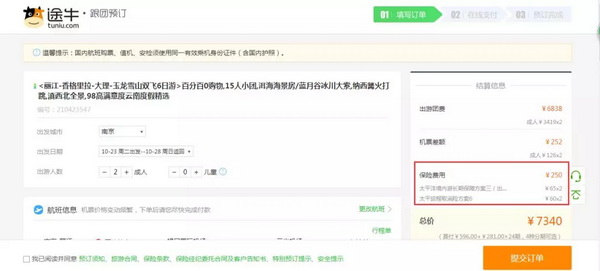 在途牛旅游网官网首页任意点击一款产品。以“丽江双飞6日游15人小团”为例,其单价为3419元,在勾选完时间和2个成人之后,页面自动跳转到结算页面。结算中,多出了保险费250元。