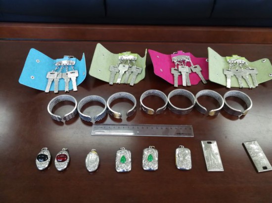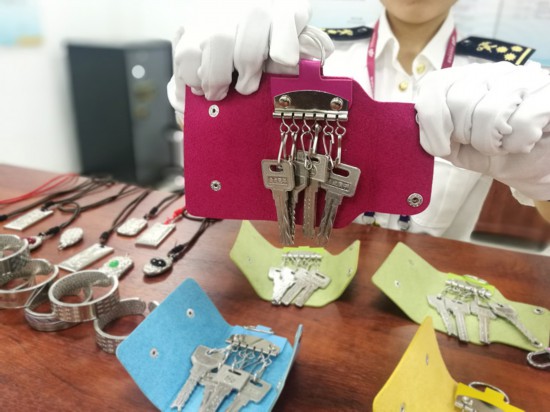 为何要带这些物品出境?查验关员多了个心眼。通过仔细查看,关员发现,这些物品的重量、色泽、手感都与普通饰品有很大差别。这些表面银色的钥匙、吊坠、手环都沉颠颠的,有的部分物品表层有磨损,露出了金色。进一步查验发现,这些物品表面涂有一层银粉类的物质,用小刀稍加一刮就掉了,露出金色,疑似黄金制品。