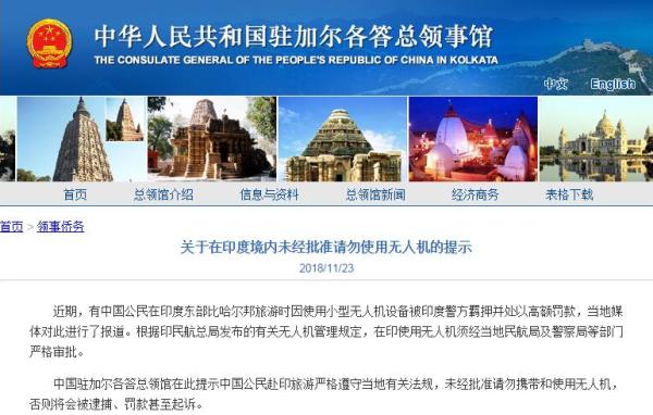 中国驻加尔各答总领馆在此提示中国公民赴印旅游严格遵守当地有关法规,未经批准请勿携带和使用无人机,否则将会被逮捕、罚款甚至起诉。