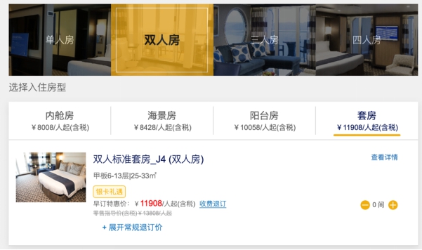 在得到首航消息后,立即登录皇家加勒比官网,预定好了含有银卡礼遇的双人标准套房,你以为这样的顶级海上之旅价格会很贵?那就大错特错了,只要平易近人的人均价格就可以享受绝佳的海洋体验,