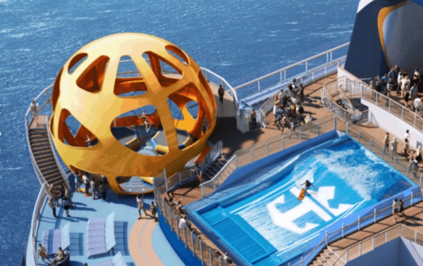 与我一样体验过海洋量子号的人绝对记得精彩的北极星,而在海洋光谱号上则带来了全新的标志性娱乐设施——南极球!与船艏北极星相对,位于船尾左旋、直径为11米中空橙色球体,名为南极球,其灵感来源于自由落体从北极出发,穿越地心最终抵达南极,在地球引力作用下发生的物理加速与减速过程。球外是悬空玻璃步道,球内设有4个蹦极床,为游客模拟穿越地心之旅,伴之以VR科技创造的视觉历险体验。