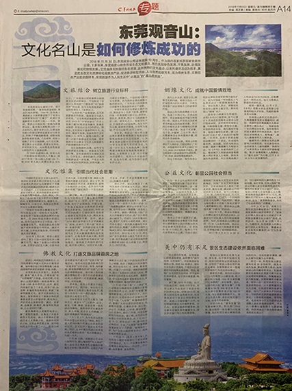 羊城晚报2018年11月9号刊载整版专题,标题“东莞观音山:文化名山是如何修炼成功的”格外引人注目。这期整版的报道,洋洋洒洒近万字,详细介绍了观音山国家森林公园的发展特征。引言部分更加清晰精炼:“2018年11月30日,东莞观音山将迎来建园19周年。作为国内首家民营国家级森林公园,十多年来,东莞观音山始终贯彻生态文明理念,努力实现绿色发展、平衡发展、协调发展和可持续发展。它凭借得天独厚的生态资源,运用独特的文化驱动,以系列盛世活动为抓手,真正把生态文化资源转化成旅游产品,促进旅游转型升级、人与自然和谐共生,成为森林生态、文旅结合产业的全国样本,实现旅游作为人民生活中“必需品”的“高品质供给””。观音山国家森林公园已经成为东莞旅游乃至广东旅游的一张靓丽名片。