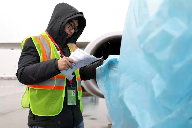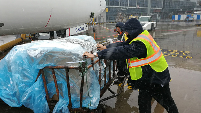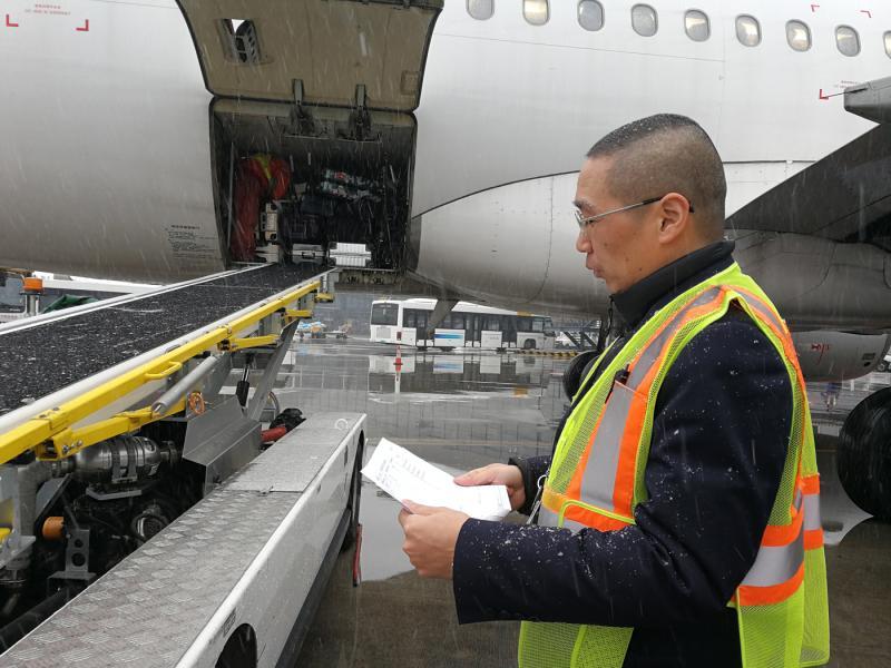 雨雪中,东航监装监控员不穿雨衣坚守岗位。
