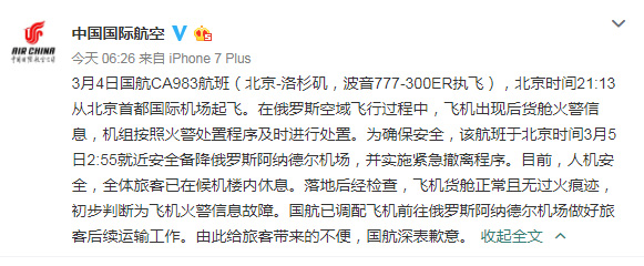 3月5日消息,3月4日国航CA983航班(北京-洛杉矶,波音777-300ER执飞),北京时间21:13从北京首都国际机场起飞。在俄罗斯空域飞行过程中,飞机出现后货舱火警信息,机组按照火警处置程序及时进行处置。为确保安全,该航班于北京时间3月5日2:55就近安全备降俄罗斯阿纳德尔机场,并实施紧急撤离程序。目前,人机安全,全体旅客已在候机楼内休息。落地后经检查,飞机货舱正常且无过火痕迹,初步判断为飞机火警信息故障。国航已调配飞机前往俄罗斯阿纳德尔机场做好旅客后续运输工作。由此给旅客带来的不便,国航深表歉意。