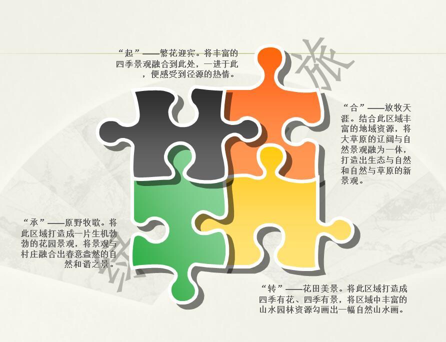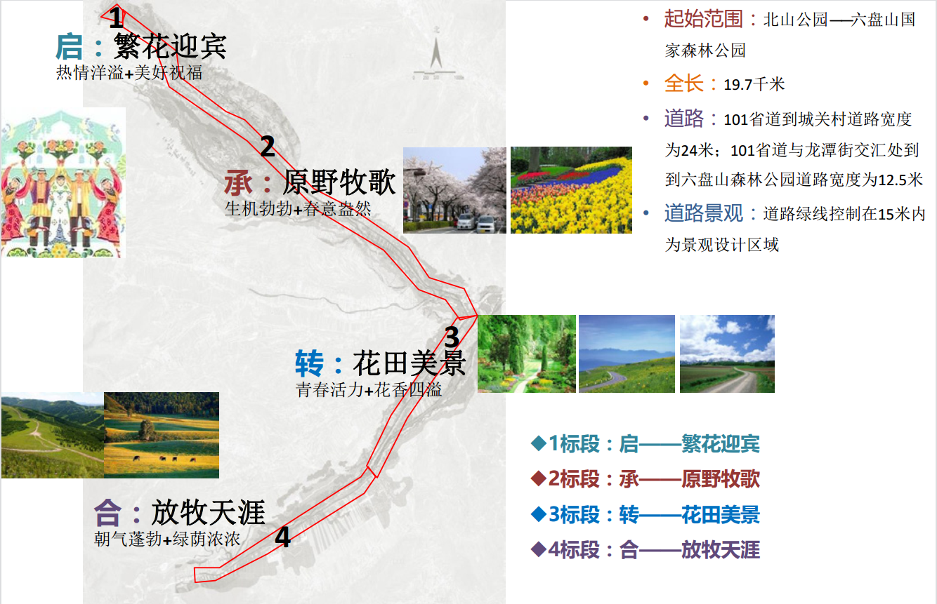 针对道路绿线通过"|起、承、转、合"四个标段来营造不同氛围景观环境
