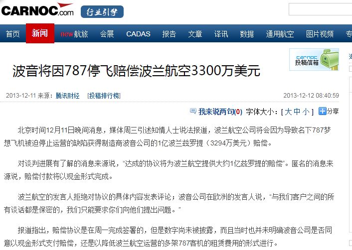 刀哥上面提到了波音787 机型锂电池问题停飞事件中,日本全日空航空就损失了14亿日圆,其他国家也有类似的损失。但赔偿方面,搜索新闻却只能找到,仅有波音赔了3300万美元给波兰航空公司的报道。