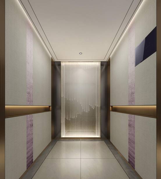 电梯及走廊-自在随行:进入电梯间,那一抹紫再次浮现在轿厢墙布上,主背景透光玻璃提升了质感。步入走廊,只见柔和的灯光,与模块化的天花造型配搭,相互映衬,自在感,也持续蔓延。