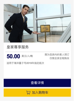 而除了餐饮以外,也可以提前预定WIFI、酒水套餐、娱乐项目,如果购买的舱位在套房一下,想要体验更好的服务,也可以选择购买全程的皇家尊享服务,体验专属登船、酒廊、餐厅及其他专属服务。