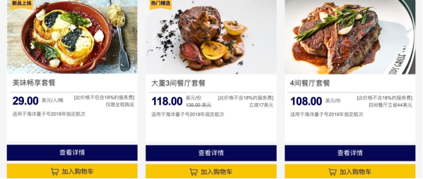而与在线值船一样方便快捷的就是皇家行前订,可以在上船之前提前购买各类餐饮套餐以及WIFI,在这里我要向大家强烈推荐船上收费餐厅套餐,8天的行程可以选择大董三间套餐+四间套餐,这样就可以体验到包括招牌的大董意境坊在内的一共7间收费餐厅了!