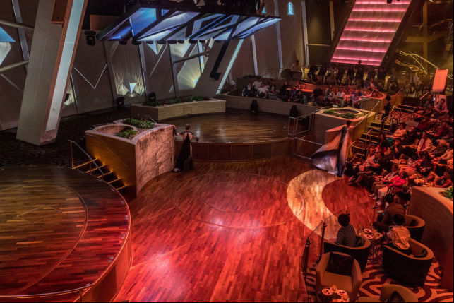 在海洋量子号五楼船尾的尽头,就是邮轮上颇具魅力的270度景观厅,白天的时候在这里不仅能够观赏到270度的极致海景,在晚上还能观赏到著名的星海传奇表演!
