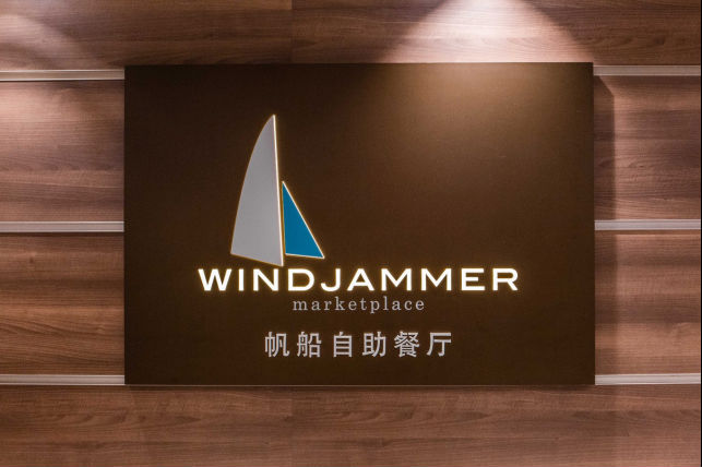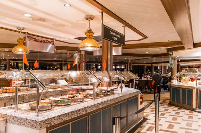 帆船自助餐厅用餐是海洋量子号上最大的餐厅,能够同时容纳上千位游客同时用餐之余,还能维持食物的不断轮转更新。