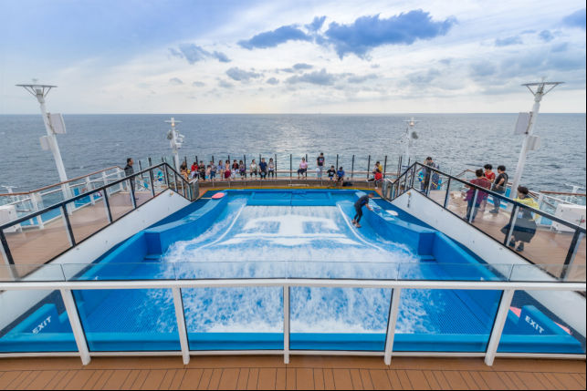 逛完室内的运动空间,便来到14层的游泳甲板,三月虽然已经转暖但难免还是有些寒意的,如果想挑战水上娱乐项目在巡航日中午室外水温合适的时候,也可以去玩玩甲板冲浪,大家可以根据自己的身体体质,挑选时间去体验。
