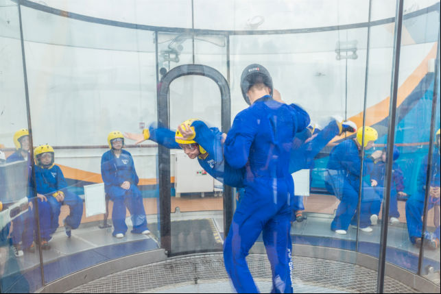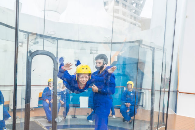 还不够刺激? 而作为量子船系的一项创举,“甲板跳伞”通过垂直的风洞产生气流,让想尝试极限运动的你体验在游轮上空飞翔同时俯瞰海面的超凡体验。