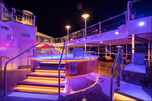 宽大的阳台配有一个双人按摩浴缸,在舱房内就可以躺进去舒缓整日疲惫感,夜晚还可直接躺在浴缸里看着满天星空。再者冬日夜晚的海面难免会有凉意,泡在热水中要多惬意就有多惬意。阳台也非常适合开趴,可惜我们这次只有三个人,也只好去酒吧放肆嗨了。