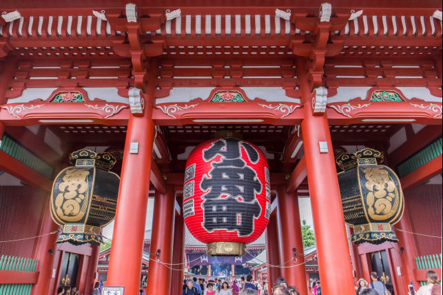 浅草寺是东京历史最悠久、人气最旺的寺院,也是浅草地区的中心,供奉的本尊是圣观音。它始建于7世纪,因屡遭火灾,后被重建。相传因三位渔民出海捕鱼时捞起了一座约5.5厘米高的金观音小雕像,才修建了这座庙宇。风雷神门浅草寺的象征是入口处的风雷神门,左右分别是镇守寺院的风神和雷神,大门上挂着写有“雷门”两字的巨大红灯笼,非常气派。门后挂着两个巨大的草鞋。