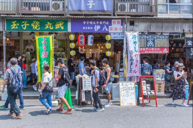 浅草寺前有条每天都人潮涌动的街道名为“仲见世”,这条长约300余米的参道上聚集有上百家不同的商铺,不管是御守、布袋还是各种食物等一系列的日式产物都能在这寻觅到它们的踪迹。是一个来买和果子,人形烧,伴手礼的好地方。也是最多人穿和服走来走去的地方。浅草也是史上连载最久漫画《乌龙派出所》主人公两津勘吉的故乡。
