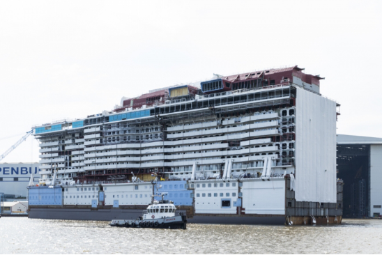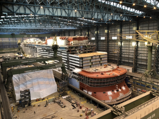 2018年5月,船身上半部分的客房和公共设施也在德国帕彭堡造船厂干区同步建设,随后整个前区客房将与船骨进行安装。