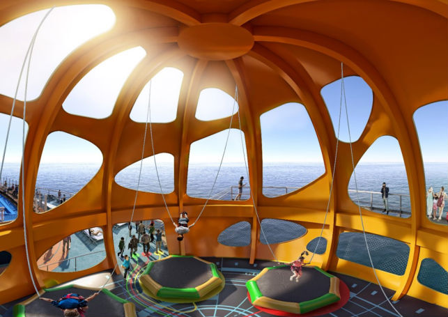 从外观就可以看到的,在与船艏北极星相对的船尾甲板左旋,添加了一个超量子号标志性设施,它的外表是一个直径为11米中空橙色球体,皇家加勒比称它为 —— 南极球,设计师希望通过南极球的到来,让北极星与南极球可以串联起来,南极球内还修建了四个蹦极床,为游客模拟穿越地心之旅,伴之最新的VR科技给旅人们到来视觉历险的体验。