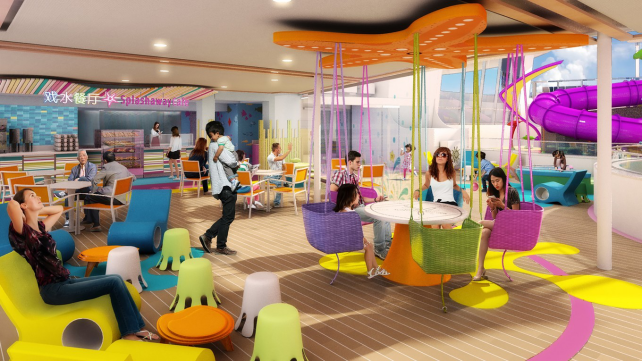如果带着小孩来这里,孩子简直太开心,位于14层甲板有一间戏水餐厅,这里紧邻儿童戏水区域,搭配上绚烂的色彩的童趣造型桌椅,瞬间将亲子用餐变成又一场游乐体验。