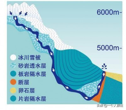 (昆仑山饮用天然矿泉水的形成及补给示意图)