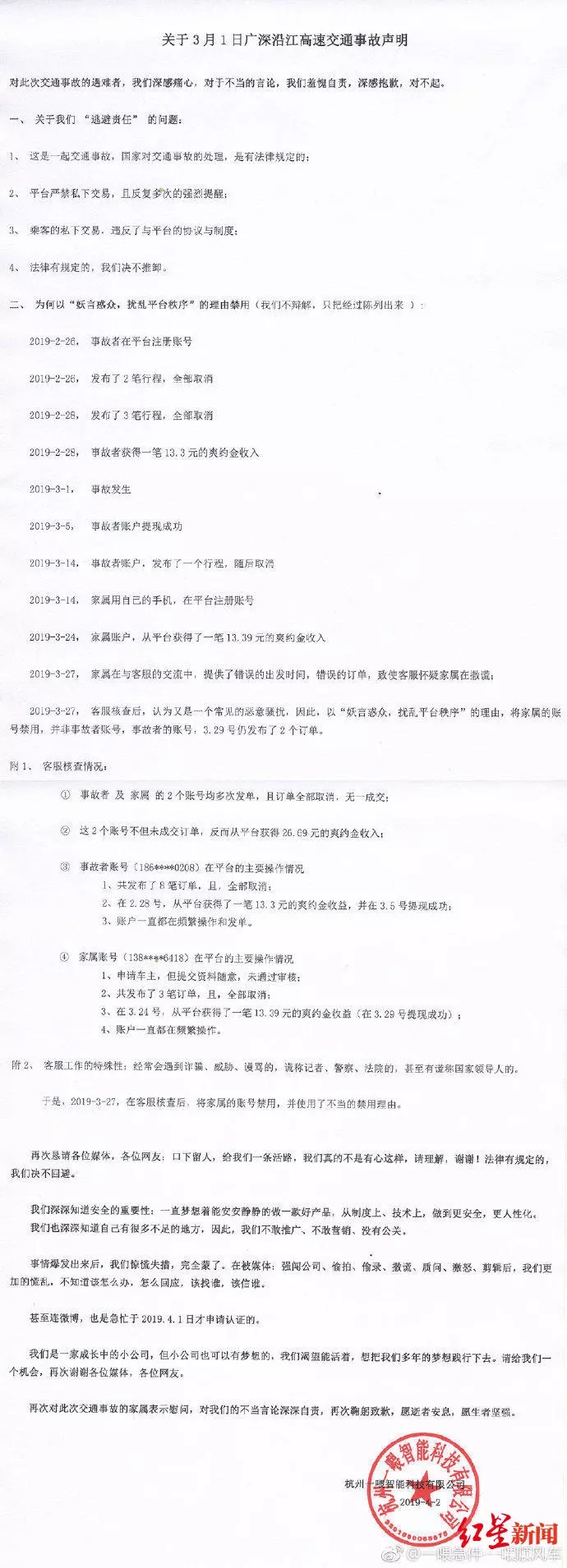 事故发生一个月后,4月2日下午,“一喂”顺风车平台通过其官方微博发表声明并道歉。视频中,一喂顺风车app的运营主体杭州一喂智能科技有限公司法定代表人樊伟解释了关于“逃避责任”以及为何封掉大学生家属的账号等问题,并鞠躬致歉。