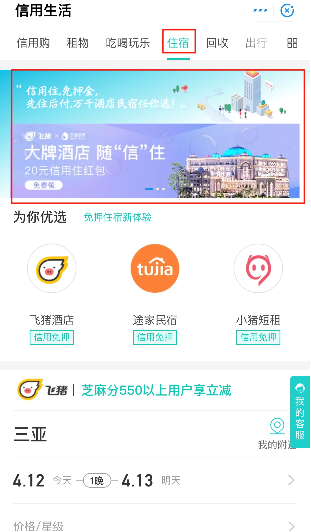 选择上方的“住宿”选项就可以进入“信用住”的页面了。你想去哪里玩,就把位置定位到哪里。比如去热带风情去三亚度个假,在填写地点处填:三亚,点击搜索,就会看到一系列的三亚热门酒店。