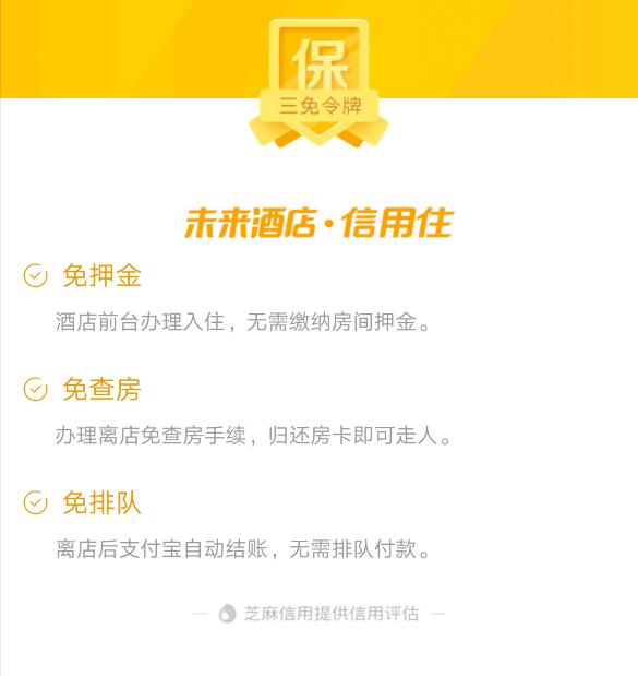 没错,这就是芝麻信用的信用住服务。只要你的芝麻分达到要求,就可以在旅行住宿的过程中享受到“三免”的VIP服务。免押金让押金不再占用出行资金;免查房让你离店退房时不用等待;免排队帮你自动结账无需排队付款。