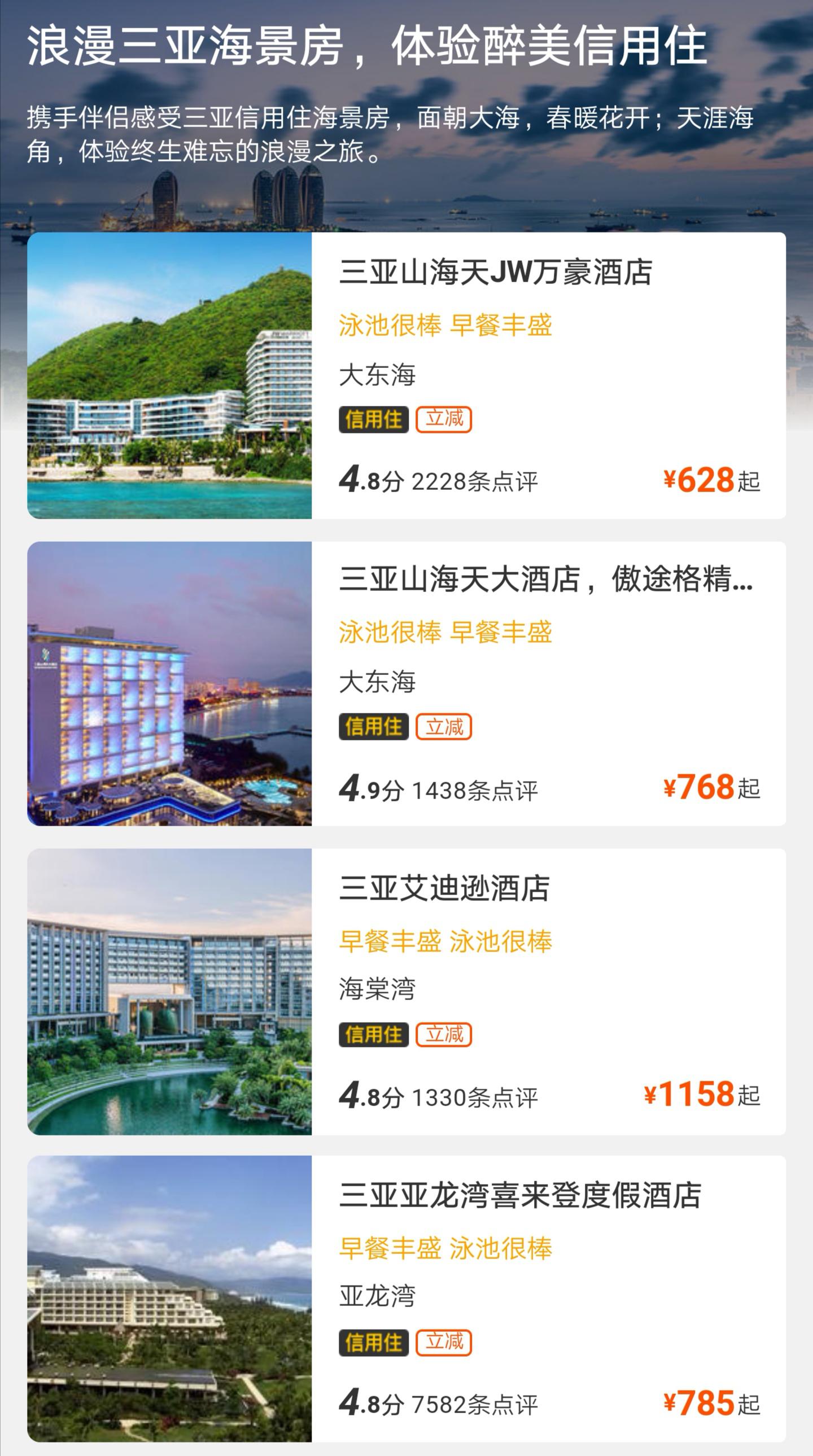 万豪、山海天、艾迪逊、亚龙湾等大酒店都有信用住服务,是不是心已经飞到热带的岛屿游泳了,赶快选择自己心仪的酒店,定好出游计划,下次放假就要等6月的端午节了!