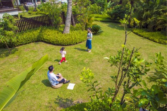 有别于其余的景观绿化,悦景庄在景观设计上种植了大量的可食化景观。悦景庄里更像是在果园、花园、植物园中。被热带植物迷乱眼睛、被树上的杨桃、菠萝蜜、无花果、鸡蛋果、柚子所惊艳,水果采摘、品尝,如同在自家一般。