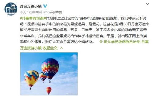 针对网上流传的“游客哄抢展览花”视频一事,贵州丹寨万达旅游小镇官方微博今日发布声明称,视频中的油菜花为景观道具,是假花。并且,那些花也为景区所赠。