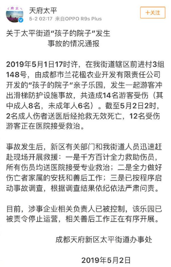 5月2日报道,5月1日,小长假的第一天,位于成都天府新区太平镇的一家名为“孩子的院子”的游乐园,发生了一起游客冲出滑梯防护设施事故。事故造成2名成人伤者送医后抢救无效死亡,其他12名受伤游客正在医院接受救治。目前,涉事负责人已被控制,游乐场已暂停营业。