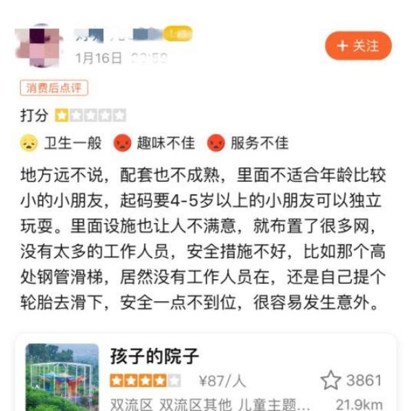 实际上,网上关于孩子的院子的质疑有不少,某知名点评网站上就有不少差评,设备简陋、安全人员不到位、项目危险度高等三项质疑频繁出现。5月1日上午的时候,该网站还能打开看到跟“孩子的院子”相关的购买信息和评论,到下午的时候,该网站跟“孩子的院子”乐园相关的信息全部删除了,无法打开。