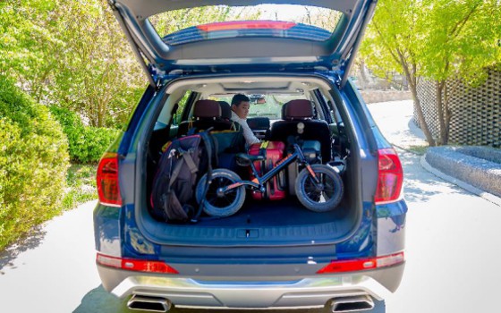 这辆车最吸引我的就是它有个指纹识别功能,我提前录入了指纹,所以没有车钥匙也可以轻松解锁车辆。绕到车后,从后门边上按下按钮放倒第三排座,一个591L的超大后备箱立刻展现,把两个登机箱,孩子的自行车、帐篷,还有几个手提包都放进去后面还剩下大把的空间。