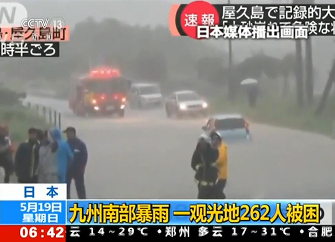 日本气象厅表示,九州岛南部持续有暖湿空气从东部海面涌入,屋久岛18日每小时降雨量一度达120毫米,在12小时内更录得420毫米雨量,相当于去年5月份的总降雨量。