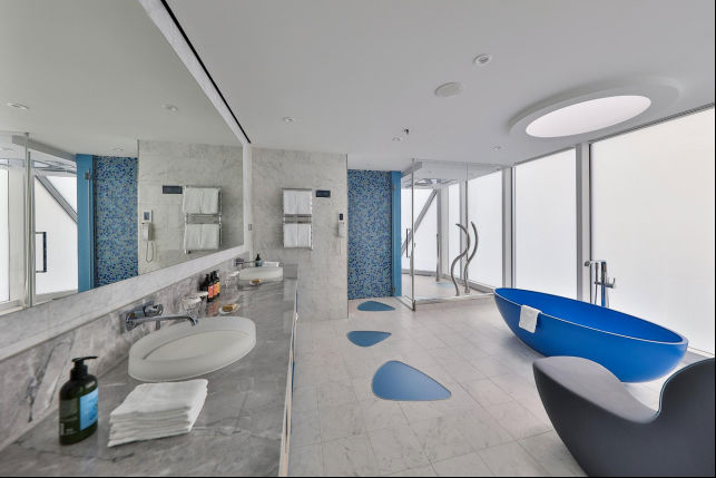 两个完全分离开的洗漱台 深蓝色的大浴缸