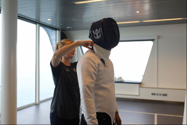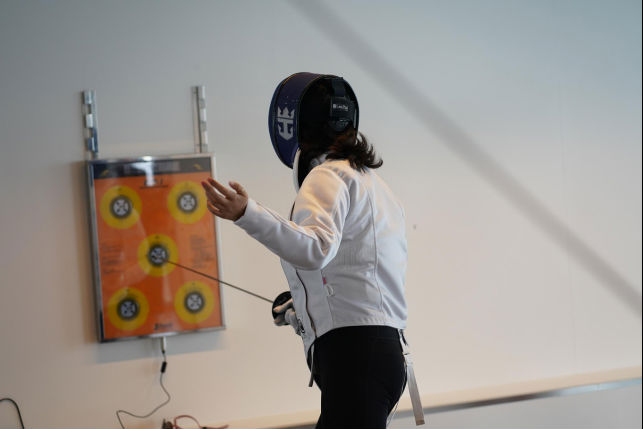 在击剑室里 会有专门的教练来帮你佩戴头盔和穿专业的衣服