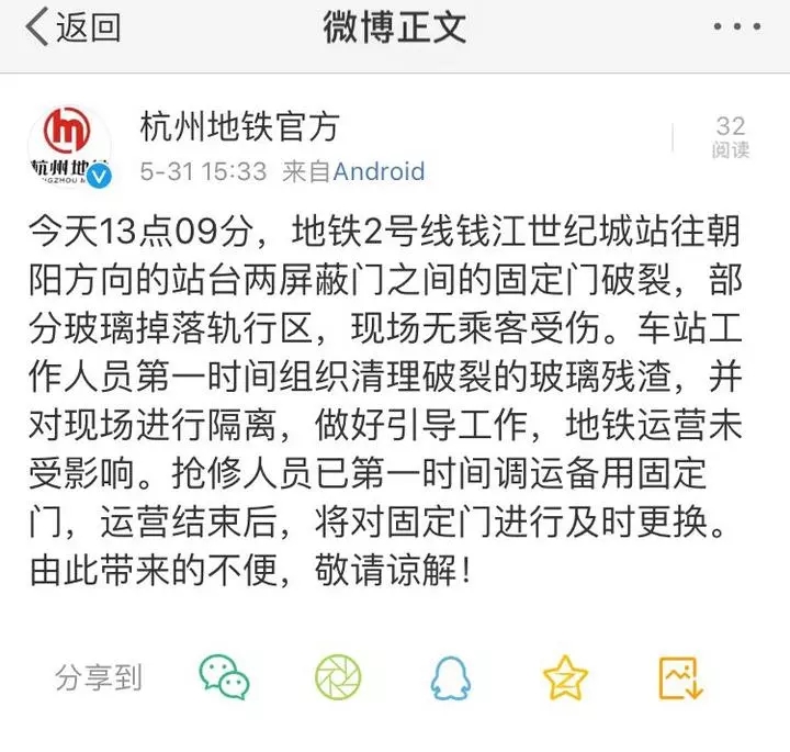 5月31日15点33分,微博@杭州地铁官方对此事件进行回应